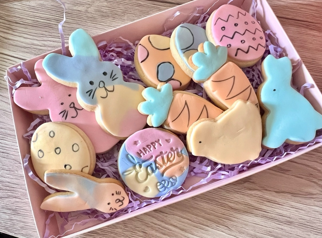 This delightfully delicious Easter biscuit box contains 12 of my best selling vanilla sugar cookie biscuits, each topped with hand dyed and hand decorated fondant icing. Yum!